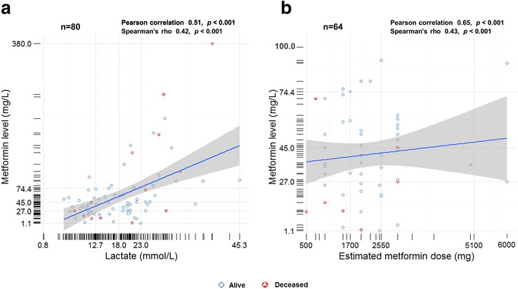 Results: A total of 253 unique cases were identified with cumulative mortality of 17.2%. Eighty-seven percent of patients had acute kidney injury. Serum lactate level was significantly higher in non-survivors (median 22.5 mmol/L) than in survivors (17.0 mmol/L, p-value <0.01) and so did the median blood metformin concentrations (58.5 vs. 43.9 mg/L, p-value = 0.05). The survival advantage was not significantly different between the modalities of RRT. The adjusted odds ratio of mortality for every one mmol/L increase in serum lactate level was 1.09 (95% CI 1.02-1.17, p-value = 0.01). The dose-response curve indicated a lactate threshold greater than 20 mmol/L was significantly associated with mortality.