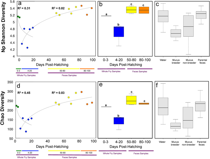 Fish gut microbial communities play key functions for their hosts, but their ontogenesis is poorly understood. Recent studies on the zebrafish suggest that gut symbionts are recruited naturally through horizontal transmission from environmental water. We used an alternative fish model, the discus (Symphysodon aequifasciata), to identify the main factors driving fish gut microbiota ontogenesis. The discus exhibits a unique parenting behavior: both discus parents vertically feed their fry with a cutaneous mucus secretion during three weeks post-hatching. We hypothesized that vertical microbial transmission via parental mucus feeding, along with horizontal transmission of environmental microbial symbionts, helps to shape the taxonomic structure of the discus fry gut microbiota. To assess this premise, we thoroughly documented the gut microbiota ontogenesis of a discus progeny during 100 days post-hatching. The V4 16S rRNA gene was sequenced to assess taxonomic structure of fry gut, parent mucus, and water samples. Our main results suggest that specific microbial symbionts both from the parents skin mucus and environmental water play important roles in shaping the structure of the fry gut microbiota.