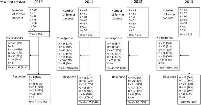 Results: Baseline data at clinical assessment were available for 952 patients, of whom 440 (46.2%) provided 1-year follow-up data. Treatment data were available for 435/440 (98.9%) of these patients, of whom 175 (40.2%) had been discharged at time of follow-up. Therapy programmes varied substantially in mode of delivery (individual or group) and number of sessions. Overall change in health 1 year after first attending specialist services was 'very much' or 'much better' for 27.5% (115/418) of patients, 'a little better' for 36.6% (153/418), 'no change' for 15.8% (66/418), 'a little worse' for 12.2% (51/418), and 'worse' or 'very much worse' for 7.9% (33/418). Among former patients who provided 2- to 5-year follow-up (30.4% (385/1265)), these proportions were 30.4% (117/385), 27.5% (106/385), 11.4% (44/385), 13.5% (52/385), and 17.1% (66/385), respectively. 85.4% (327/383) of former patients responded "Yes" to "Do you think that you are still suffering from CFS/ME?" 8.9% (34/383) were "Uncertain", and 5.7% (22/383) responded "No".