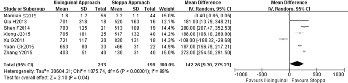 Results: Eight articles were included in the meta-analysis. Through comparing the efficacy and safety of ilioinguinal approach and Stoppa approach in the treatment of displaced acetabular fracture, statistical significance was found in the average operation time [WMD = 68.29, 95% CI (10.52, 126.05), p < 0.05] and the median intraoperative blood loss [WMD = 142.26, 95% CI (9.30, 275.23), p < 0.05]. However, there existed no statistical significance in the fracture end reset satisfaction rate [RR = 0.63, 95% CI (0.17, 2.37), p > 0.05], the early complications rate [RR = 0.89, 95% CI (0.33, 2.40), p > 0.05], the late complications rate [RR = 0.91, 95% CI (0.27, 3.01), p > 0.05], and Harris hip score good function rate [RR = 0.52, 95% CI (0.25, 1.10), p > 0.05].