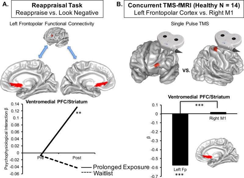 Results: Treatment-specific changes were observed only during cognitive reappraisal of negative images. Psychotherapy increased lateral frontopolar cortex activity and connectivity with the ventromedial prefrontal cortex/ventral striatum. Greater increases in frontopolar activation were associated with improvement in hyperarousal symptoms and psychological well-being. The frontopolar cortex also displayed a greater variety of temporal resting-state signal pattern changes after treatment. Concurrent transcranial magnetic stimulation and fMRI in healthy participants demonstrated that the lateral frontopolar cortex exerts downstream influence on the ventromedial prefrontal cortex/ventral striatum.