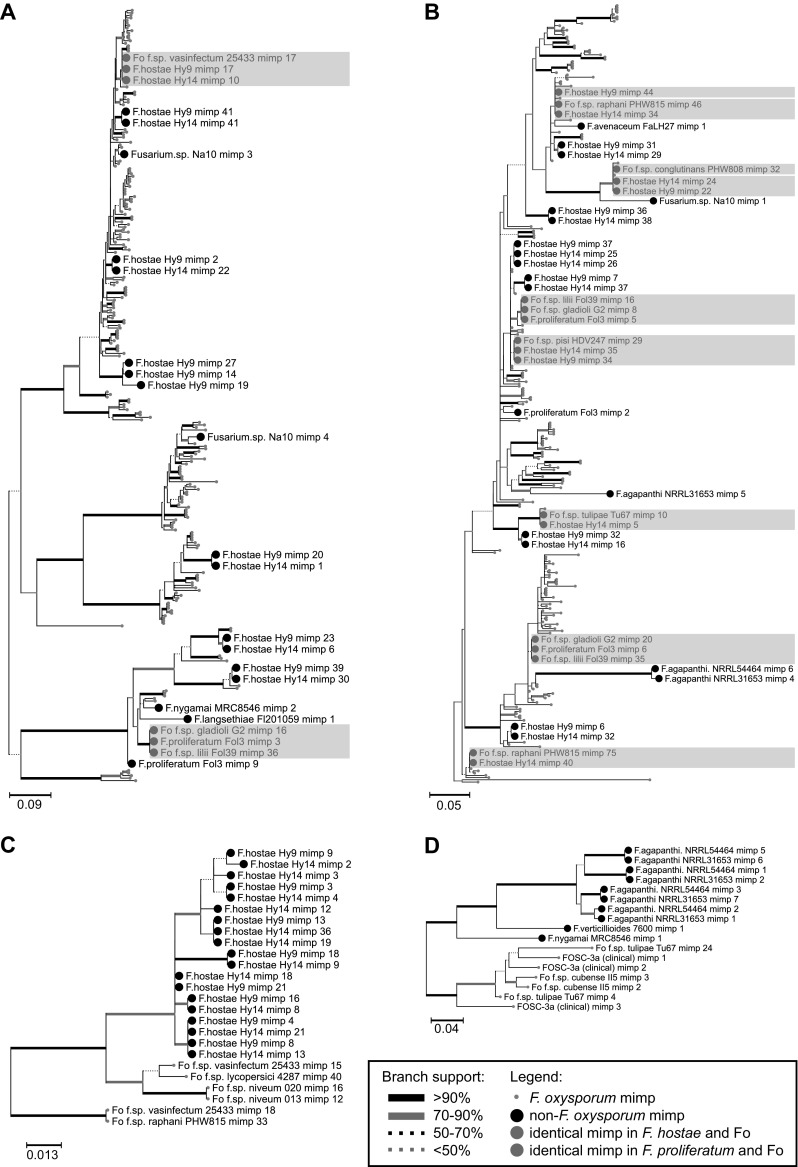The mimp family of miniature inverted-repeat transposable elements was previously found only in genomes of Fusarium oxysporum and is contextually associated with virulence genes in this species. Through extensive comparative analysis of 83 F. oxysporum and 52 other Fusarium genomes, we uncovered the distribution of different mimp families throughout the genus. We show that (i) mimps are not exclusive to F. oxysporum; (ii) pathogenic isolates generally possess more mimps than non-pathogenic strains and (iii) two isolates of F. hostae and one F. proliferatum isolate display evidence for horizontal transfer of genetic material to or from F. oxysporum. Multiple instances of mimp elements identical to F. oxysporum mimps were encountered in the genomes of these isolates. Moreover, homologs of effector genes (SIX1, 2, 6, 7, 11 and FomAVR2) were discovered here, several with very high (97-100%) pairwise nucleotide sequence identity scores. These three strains were isolated from infected flower bulbs (Hyacinthus and Lilium spp.). Their ancestors may thus have lived in close proximity to pathogenic strains of F. oxysporum f. sp. hyacinthi and f. sp. lilii. The Fo f. sp. lycopersici SIX2 effector gene was found to be widely distributed (15/18 isolates) throughout the F. fujikuroi species complex, exhibiting a predominantly vertical inheritance pattern. These findings shed light on the potential evolutionary mechanism underlying plant-pathogenicity in Fusarium and show that interspecies horizontal gene transfer may have occurred.