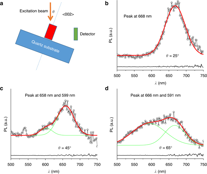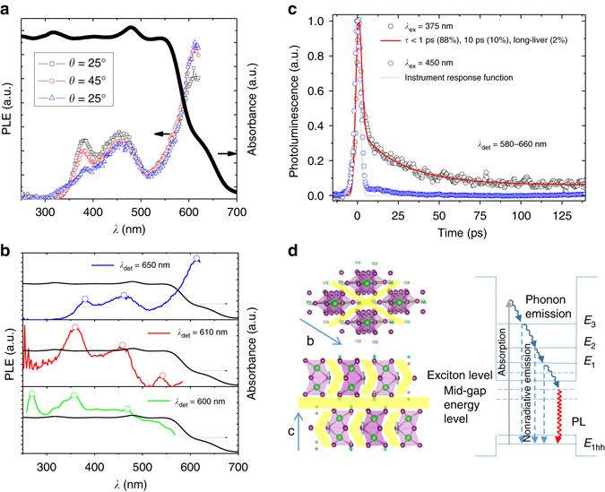 A metal-organic hybrid perovskite (CH3NH3PbI3) with three-dimensional framework of metal-halide octahedra has been reported as a low-cost, solution-processable absorber for a thin-film solar cell with a power-conversion efficiency over 20%. Low-dimensional layered perovskites with metal halide slabs separated by the insulating organic layers are reported to show higher stability, but the efficiencies of the solar cells are limited by the confinement of excitons. In order to explore the confinement and transport of excitons in zero-dimensional metal-organic hybrid materials, a highly orientated film of (CH3NH3)3Bi2I9 with nanometre-sized core clusters of Bi2I93- surrounded by insulating CH3NH3+ was prepared via solution processing. The (CH3NH3)3Bi2I9 film shows highly anisotropic photoluminescence emission and excitation due to the large proportion of localised excitons coupled with delocalised excitons from intercluster energy transfer. The abrupt increase in photoluminescence quantum yield at excitation energy above twice band gap could indicate a quantum cutting due to the low dimensionality.Understanding the confinement and transport of excitons in low dimensional systems will aid the development of next generation photovoltaics. Via photophysical studies Ni et al. observe 'quantum cutting' in 0D metal-organic hybrid materials based on methylammonium bismuth halide (CH3NH3)3Bi2I9.