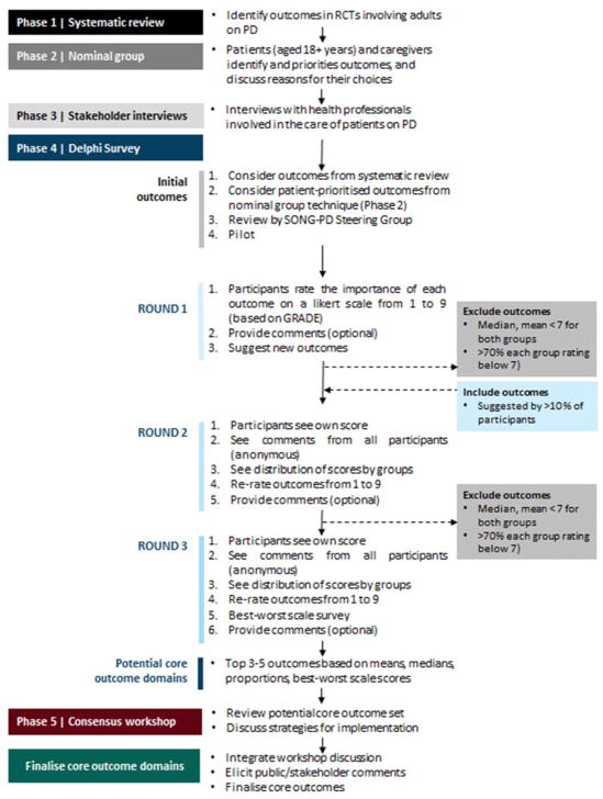 Methods: The 5 phases in the SONG-PD project are: a systematic review to identify outcomes and outcome measures that have been reported in randomized trials involving patients on PD; focus groups using nominal group technique with patients and caregivers to identify, rank, and describe reasons for their choice of outcomes; semi-structured key informant interviews with health professionals; a 3-round international Delphi survey involving a multi-stakeholder panel; and a consensus workshop to review and endorse the proposed set of core outcome domains for PD trials.