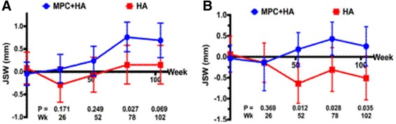 Results: Moderate arthralgia and swelling within 24 h following injection that subsided were observed in 4 out of 11 in the MPC + HA group and 0 out of 6 HA controls. No cell-related serious adverse effects were observed. Increases in class I PRA >10% were observed at week 4 in the MPC + HA group that decreased to baseline levels by week 104. Compared with the HA group, MPC + HA-treated patients showed greater improvements in KOOS pain, symptom, activities of daily living, and SF-36 bodily pain scores (p < 0.05). The MPC + HA group had reduced medial and lateral tibiofemoral joint space narrowing (p < 0.05), less tibial bone expansion (0.5% vs 4.0% over 26 weeks, p = 0.02), and a trend towards reduced tibial cartilage volume loss (0.7% vs -4.0% over 26 weeks, p = 0.10) than the HA controls.