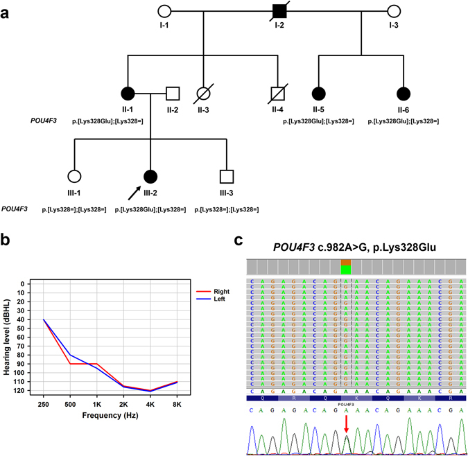 Autosomal dominant non-syndromic hearing loss (ADNSHL) is genetically heterogeneous with more than 35 genes identified to date. Using a massively parallel sequencing panel targeting 159 deafness genes, we identified a novel missense variant of POU4F3 (c.982A>G, p.Lys328Glu) which co-segregated with the deafness phenotype in a three-generation Taiwanese family with ADNSHL. This variant could be classified as a "pathogenic variant" according to the American College of Medical Genetics and Genomics guidelines. We then performed subcellular localization experiments and confirmed that p.Lys328Glu compromised transportation of POU4F3 from the cytoplasm to the nucleus. POU3F4 p.Lys328Glu was located within a bipartite nuclear localization signal (NLS), and was the first missense variant in bipartite NLS of POU4F3 validated in functional studies. These findings expanded the mutation spectrum of POU4F3 and provided insight into the pathogenesis associated with aberrant POU4F3 localization.