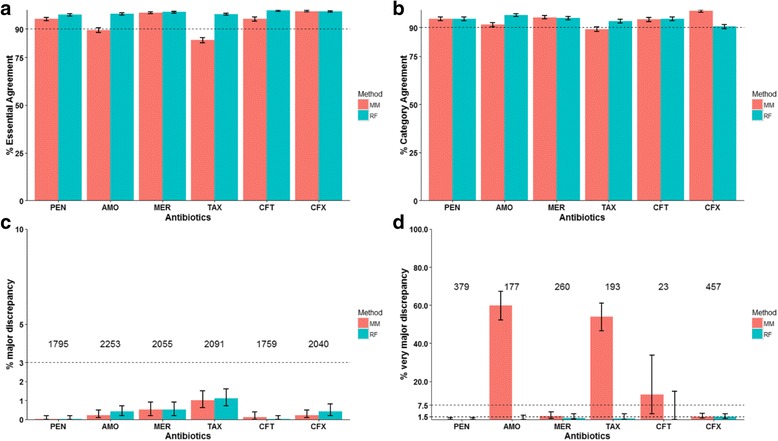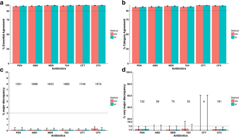 Results: The MM and RF methods were used to predict MICs of 4309 previously reported pneumococcal isolates in 2 datasets and the results were compared to the known broth microdilution MICs to 6 β-lactams. Based on a method that specifically evaluated predictions for new PBP types, the RF results were more accurate than MM results for new PBP types and showed percent essential agreement (MICs agree within ±1 dilution) >97%, percent category agreement (interpretive results agree) >93%, major discrepancy (sensitive isolate predicted as resistant) rate < 1.2%, and very major discrepancy (resistant isolate predicted as sensitive) rate < 1.4% for all 6 β-lactams. The identification of new PBP types over time was well approximated by a diminishingly increasing curve (Pearson's r = 0.99) and minimally impacted overall MIC prediction performance.