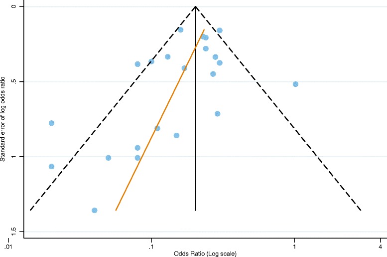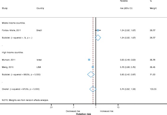 Methods: We systematically searched PubMed, Medline, Web of Science, Cinhal and Academic Search Premier and grey literature sources for studies published between January 2006 and April 2014. Studies were eligible for inclusion if they were observational measuring population effectiveness of rotavirus vaccination against health care attendances for rotavirus gastroenteritis or AGE. To evaluate study quality we use used the Newcastle-Ottawa Scale for non-randomised studies, categorising studies by risk of bias. Publication bias was assessed using funnel plots. If two or more studies reported a measure of vaccine effectiveness (VE), we conducted a random effects meta-analysis. We stratified analyses by World Bank country income level and used study quality in sensitivity analyses.