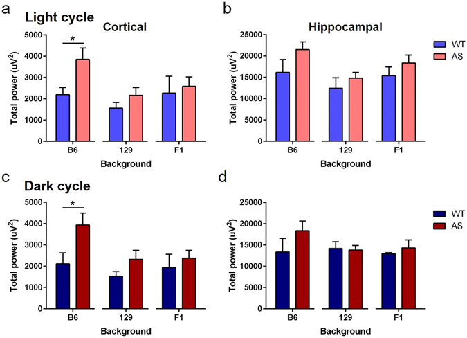 Angelman syndrome (AS) is a genetic neurodevelopmental disorder, most commonly caused by deletion or mutation of the maternal allele of the UBE3A gene, with behavioral phenotypes and seizures as key features. Currently no treatment is available, and therapeutics are often ineffective in controlling AS-associated seizures. Previous publications using the Ube3a maternal deletion model have shown behavioral and seizure susceptibility phenotypes, however findings have been variable and merit characterization of electroencephalographic (EEG) activity. In this study, we extend previous studies comparing the effect of genetic background on the AS phenotype by investigating the behavioral profile, EEG activity, and seizure threshold. AS C57BL/6J mice displayed robust behavioral impairments, spontaneous EEG polyspikes, and increased cortical and hippocampal power primarily driven by delta and theta frequencies. AS 129 mice performed poorly on wire hang and contextual fear conditioning and exhibited a lower seizure threshold and altered spectral power. AS F1 hybrid mice (C57BL/6J × 129) showed milder behavioral impairments, infrequent EEG polyspikes, and fewer spectral power alterations. These findings indicate the effect of common genetic backgrounds on the Ube3a maternal deletion behavioral, EEG, and seizure threshold phenotypes. Our results will inform future studies on the optimal strain for evaluating therapeutics with different AS-like phenotypes.