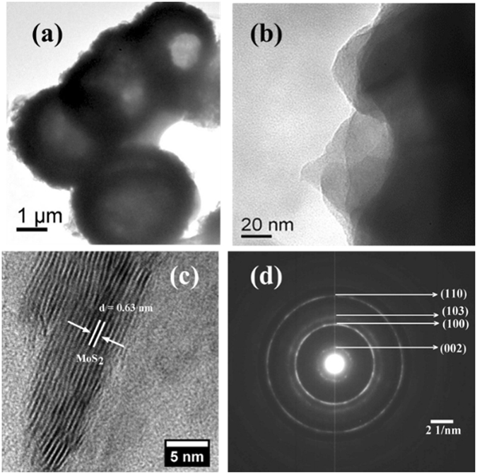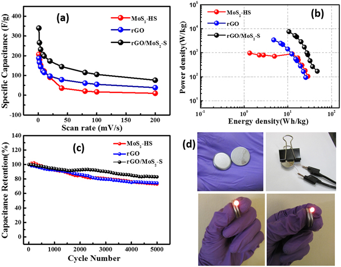 The development of efficient materials for the generation and storage of renewable energy is now an urgent task for future energy demand. In this report, molybdenum disulphide hollow sphere (MoS2-HS) and its reduced graphene oxide hybrid (rGO/MoS2-S) have been synthesized and explored for energy generation and storage applications. The surface morphology, crystallinity and elemental composition of the as-synthesized materials have been thoroughly analysed. Inspired by the fascinating morphology of the MoS2-HS and rGO/MoS2-S materials, the electrochemical performance towards hydrogen evolution and supercapacitor has been demonstrated. The rGO/MoS2-S shows enhanced gravimetric capacitance values (318 ± 14 Fg-1) with higher specific energy/power outputs (44.1 ± 2.1 Whkg-1 and 159.16 ± 7.0 Wkg-1) and better cyclic performances (82 ± 0.95% even after 5000 cycles). Further, a prototype of the supercapacitor in a coin cell configuration has been fabricated and demonstrated towards powering a LED. The unique balance of exposed edge site and electrical conductivity of rGO/MoS2-S shows remarkably superior HER performances with lower onset over potential (0.16 ± 0.05 V), lower Tafel slope (75 ± 4 mVdec-1), higher exchange current density (0.072 ± 0.023 mAcm-2) and higher TOF (1.47 ± 0.085 s-1) values. The dual performance of the rGO/MoS2-S substantiates the promising application for hydrogen generation and supercapacitor application of interest.