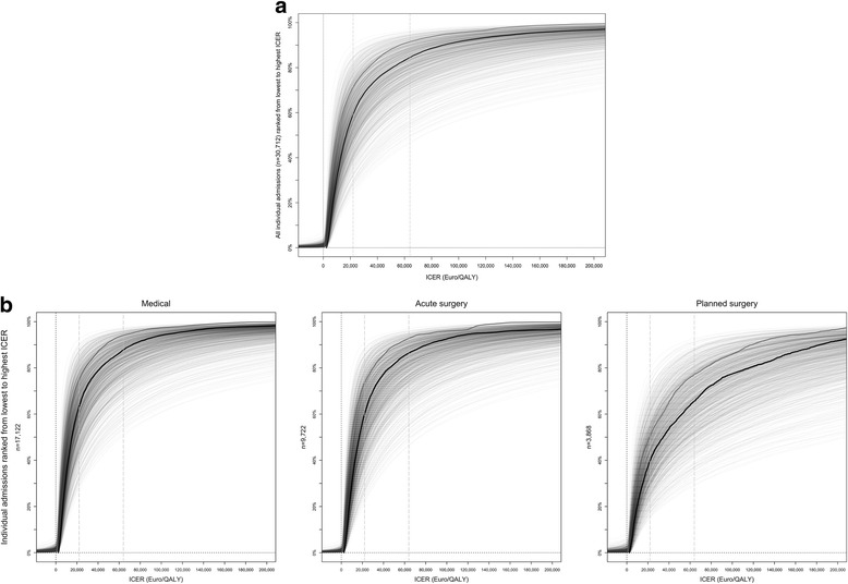 Conclusions: On average, ICU admission versus general ward care was cost-effective at a threshold of €22,000/QALY (p = 95%). According to the individualized cost-effectiveness information, one in six ICU admissions was not cost-effective at a threshold of €64,000/QALY. Almost half of these admissions that were not cost-effective can be regarded as acceptable when weighted by severity of disease in terms of expected lifetime health. Overall, existing ICU services represent reasonable resource use, but considerable uncertainty becomes evident when disaggregating into individualized results.