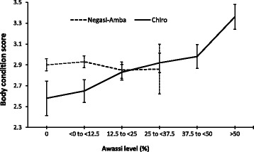 Results: We estimated admixture levels using ADMIXTURE software based on 74 AIMs selected from Ovine 50KSNP data. Awassi x Ethiopian fat-tailed crossbred sheep populations kept in government farms and farmer villages in different districts were included in the study. Mean Awassi levels estimated based on the selected AIMs were close to the Awassi levels obtained from pedigree information. Estimates from the 74 SNPs were compared to subsets of 65, 55, 45, 35, 25 and 15 SNPs selected based on both top and bottom fixation index (FST) rank using Spearman’s rank correlation (r = 0.862–0.996). A t-test comparison revealed that all SNP subsets had produced similar (P > 0.05) estimates with the 74 SNPs, except for the bottom 15 SNPs (P < 0.05). However estimates based on 45 and above SNP subsets were relatively close to the fitted regression line (r = 0.969–0.996). Association of admixture levels with lamb growth showed that Awassi level affected (P < 0.05) eight months weight in both farmer locations, lambs with higher Awassi levels were heavier. Lambing interval of ewes was longer as Awassi level increased, but this drawback was outweighed by the increased productivity of ewes in terms of eight months lamb weight per year.