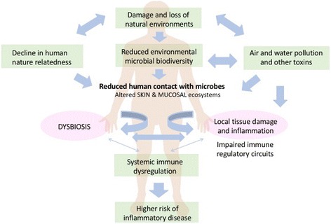 Skin barrier structure and function is essential to human health. Hitherto unrecognized functions of epidermal keratinocytes show that the skin plays an important role in adapting whole-body physiology to changing environments, including the capacity to produce a wide variety of hormones, neurotransmitters and cytokine that can potentially influence whole-body states, and quite possibly, even emotions. Skin microbiota play an integral role in the maturation and homeostatic regulation of keratinocytes and host immune networks with systemic implications. As our primary interface with the external environment, the biodiversity of skin habitats is heavily influenced by the biodiversity of the ecosystems in which we reside. Thus, factors which alter the establishment and health of the skin microbiome have the potential to predispose to not only cutaneous disease, but also other inflammatory non-communicable diseases (NCDs). Indeed, disturbances of the stratum corneum have been noted in allergic diseases (eczema and food allergy), psoriasis, rosacea, acne vulgaris and with the skin aging process. The built environment, global biodiversity losses and declining nature relatedness are contributing to erosion of diversity at a micro-ecological level, including our own microbial habitats. This emphasises the importance of ecological perspectives in overcoming the factors that drive dysbiosis and the risk of inflammatory diseases across the life course.