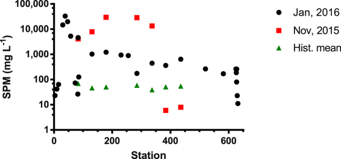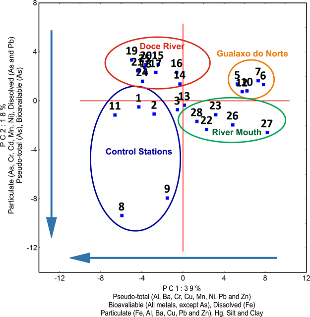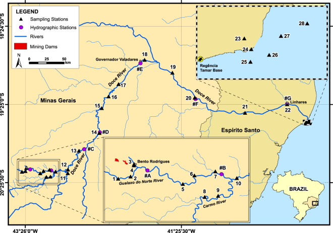 The impacts of the SAMARCO iron tailing spill along more than 650 km, between the dam and the plume of the Doce River in the Atlantic, were assessed by the determination of toxic metals. The tailing spill caused a substantial increase in suspended sediment loads (up to 33,000 mg L-1), in addition to large depositions of waste along the Doce basin. The highest estimated transport of dissolved metals was observed for Fe (58.8 μg s-1), Ba (37.9 μg s-1) and Al (25.0 μg s-1). Sediments reached the highest enrichment factors (EFs) for Hg (4,234), Co (133), Fe (43), and Ni (16), whereas As (55), Ba (64), Cr (16), Cu (17), Mn (41), Pb (38) and Zn (82) highest EFs were observed for suspended particulate matter (SPM). Iron, As, Hg, Mn exceeded sediment quality guidelines. Therefore, the risk of occurrence of adverse effects is highly possible, not only due to the dam failure, but also due to the Fe mining and the artisan Au mining. Heavy rain episodes will likely cause enhanced erosion, remobilization, and transport of contaminated particles, sustaining high inputs of SPM and metals for the years to come and threatening the ecosystem services.