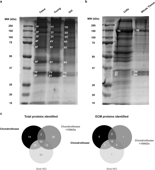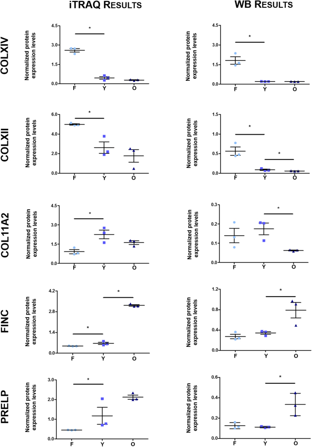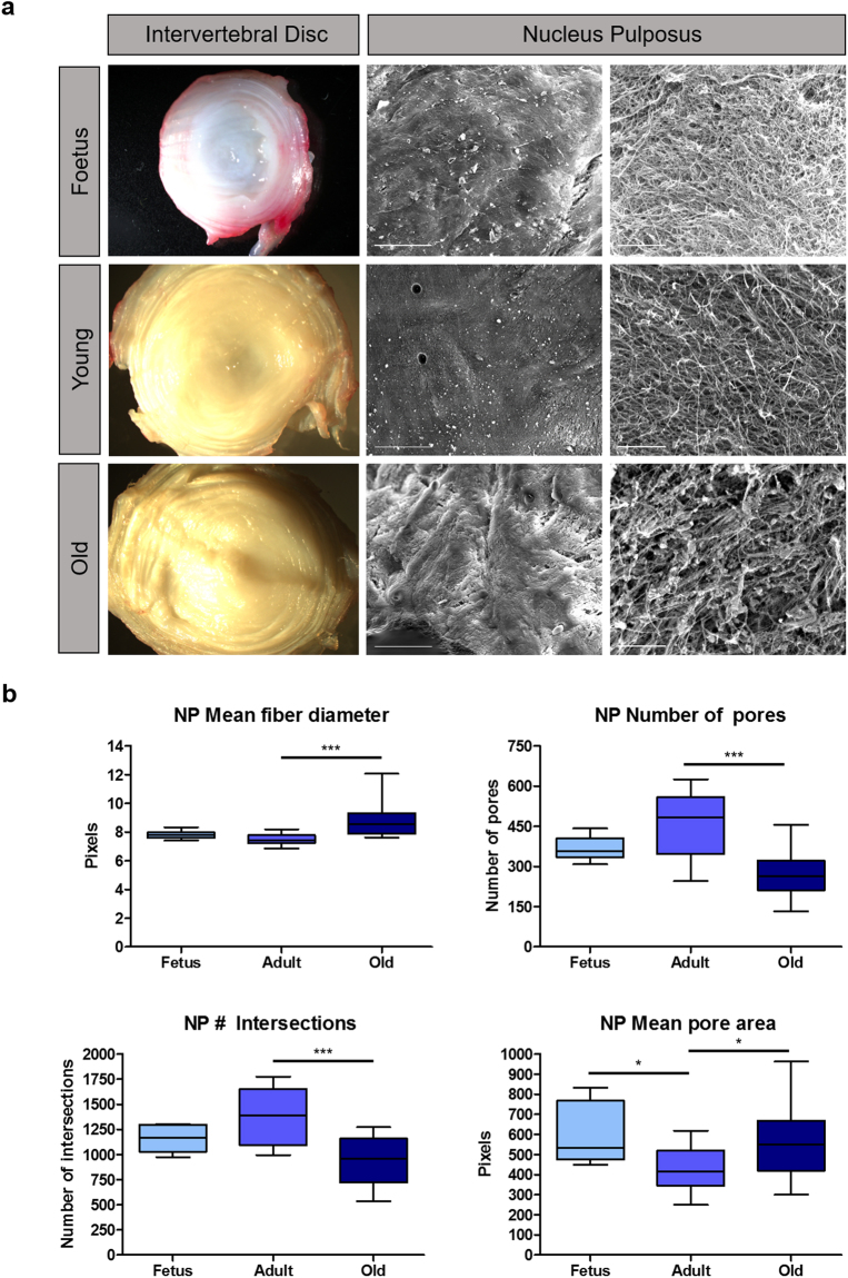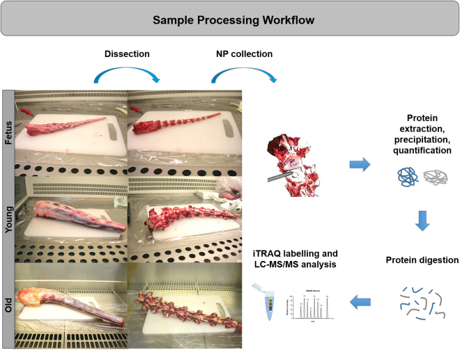 Intervertebral disc (IVD) degeneration is often the cause of low back pain. Degeneration occurs with age and is accompanied by extracellular matrix (ECM) depletion, culminating in nucleus pulpous (NP) extrusion and IVD destruction. The changes that occur in the disc with age have been under investigation. However, a thorough study of ECM profiling is needed, to better understand IVD development and age-associated degeneration. As so, iTRAQ LC-MS/MS analysis of foetus, young and old bovine NPs, was performed to define the NP matrisome. The enrichment of Collagen XII and XIV in foetus, Fibronectin and Prolargin in elder NPs and Collagen XI in young ones was independently validated. This study provides the first matrisome database of healthy discs during development and ageing, which is key to determine the pathways and processes that maintain disc homeostasis. The factors identified may help to explain age-associated IVD degeneration or constitute putative effectors for disc regeneration.