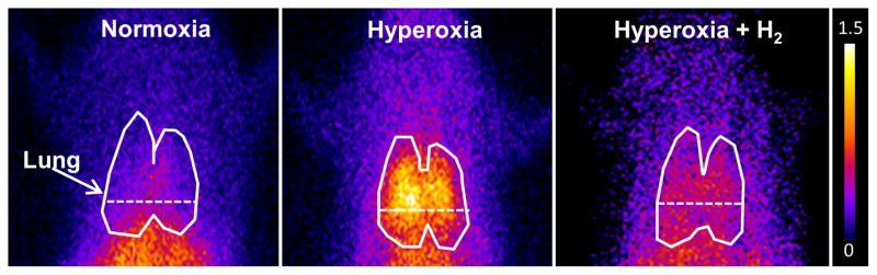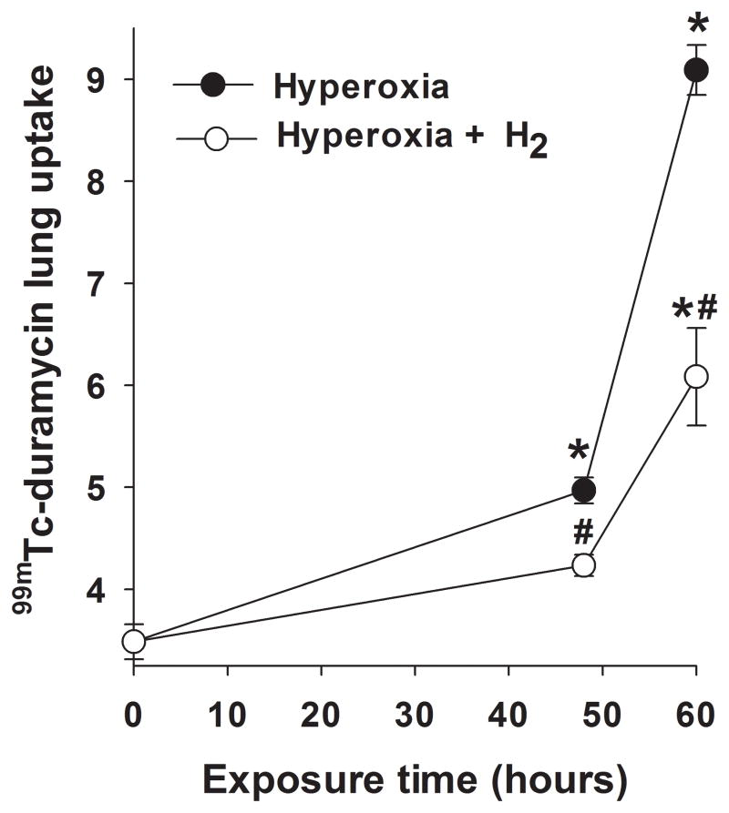 Inhaled hydrogen gas (H2) provides protection in rat models of human acute lung injury (ALI). We previously reported that biomarker imaging can detect oxidative stress and endothelial cell death in vivo in a rat model of ALI. Our objective was to evaluate the ability of Tc-hexamethylpropyleneamineoxime (HMPAO) and Tc-duramycin to track the effectiveness of H2 therapy in vivo in the hyperoxia rat model of ALI. Rats were exposed to room air (normoxia), 98% O2 + 2% N2 (hyperoxia) or 98% O2 + 2% H2 (hyperoxia+H2) for up to 60 h. In vivo scintigraphy images were acquired following injection of Tc-HMPAO or Tc-duramycin. For hyperoxia rats, Tc-HMPAO and Tc-duramycin lung uptake increased in a time-dependent manner, reaching a maximum increase of 270% and 150% at 60 h, respectively. These increases were reduced to 120% and 70%, respectively, in hyperoxia+H2 rats. Hyperoxia exposure increased glutathione content in lung homogenate (36%) more than hyperoxia+H2 (21%), consistent with increases measured in Tc-HMPAO lung uptake. In 60-h hyperoxia rats, pleural effusion, which was undetectable in normoxia rats, averaged 9.3 gram/rat, and lung tissue 3-nitrotyrosine expression increased by 790%. Increases were reduced by 69% and 59%, respectively, in 60-h hyperoxia+H2 rats. This study detects and tracks the anti-oxidant and anti-apoptotic properties of H2 therapy in vivo after as early as 24 h of hyperoxia exposure. The results suggest the potential utility of these SPECT biomarkers for in vivo assessment of key cellular pathways in the pathogenesis of ALI and for monitoring responses to therapies.