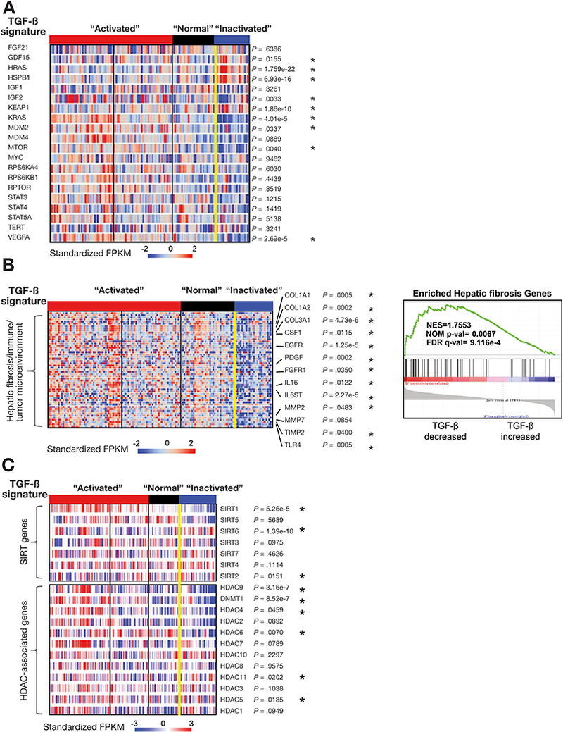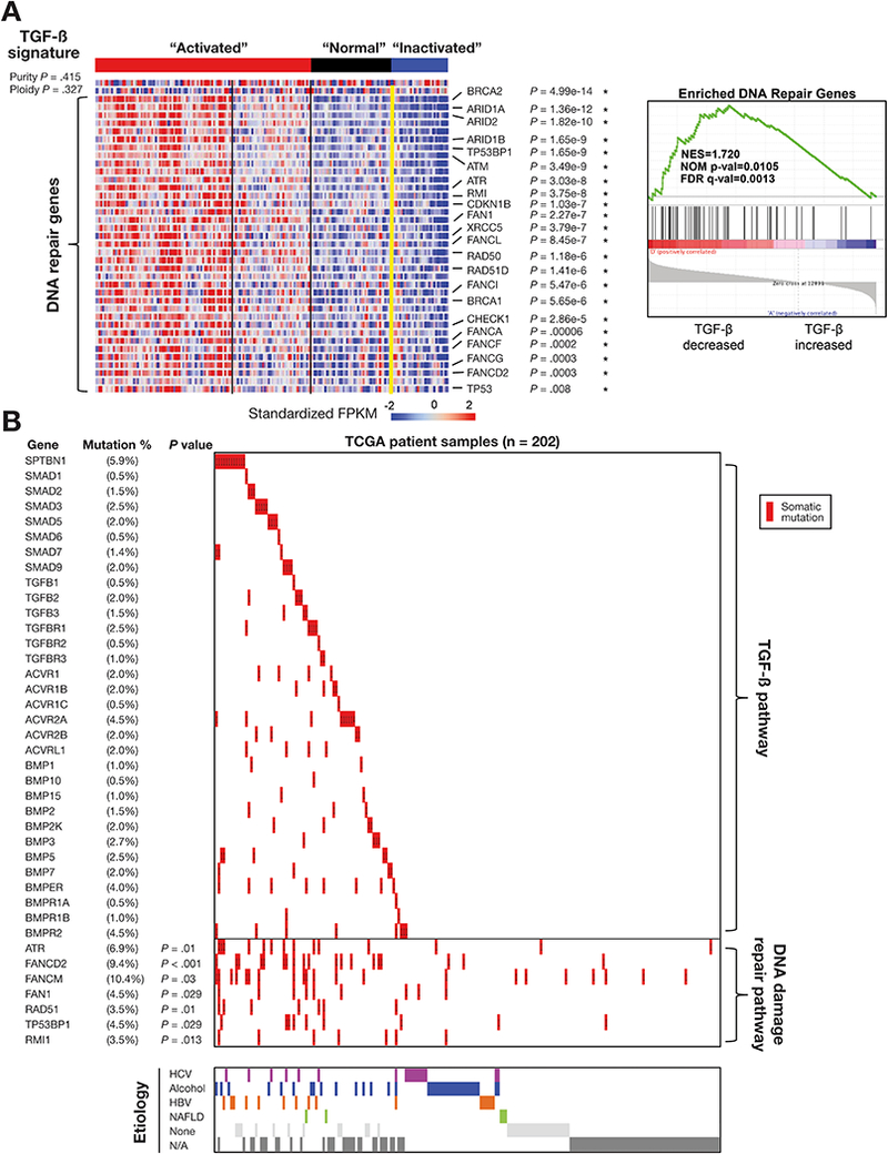 Conclusions: In genome and transcriptome analyses of HCC samples, we found mutations in genes in the TGF-β signaling pathway in almost 40% of samples. These correlated with changes in expression of genes in the pathways; up-regulation of genes in this pathway would contribute to inflammation and fibrosis, whereas down-regulation would indicate loss of TGF-β tumor suppressor activity. Our findings indicate that therapeutic agents for HCCs can be effective, based on genetic features of the TGF-β pathway; agents that block TGF-β should be used only in patients with specific types of HCCs.