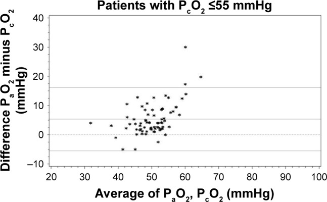 Patients and methods: Bland-Altman comparison of PaO2 and PcO2 served as the primary outcome parameter if PcO2 values were ≤60 mmHg and the secondary outcome parameter if PcO2 values were ≤55 mmHg. Pain associated with the measurements was assessed using a 100-mm visual analog scale.