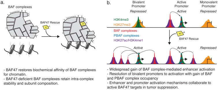 Perturbations to mammalian SWI/SNF (mSWI/SNF or BAF) complexes contribute to more than 20% of human cancers, with driving roles first identified in malignant rhabdoid tumor, an aggressive pediatric cancer characterized by biallelic inactivation of the core BAF complex subunit SMARCB1 (BAF47). However, the mechanism by which this alteration contributes to tumorigenesis remains poorly understood. We find that BAF47 loss destabilizes BAF complexes on chromatin, absent significant changes in complex assembly or integrity. Rescue of BAF47 in BAF47-deficient sarcoma cell lines results in increased genome-wide BAF complex occupancy, facilitating widespread enhancer activation and opposition of Polycomb-mediated repression at bivalent promoters. We demonstrate differential regulation by two distinct mSWI/SNF assemblies, BAF and PBAF complexes, enhancers and promoters, respectively, suggesting that each complex has distinct functions that are perturbed upon BAF47 loss. Our results demonstrate collaborative mechanisms of mSWI/SNF-mediated gene activation, identifying functions that are co-opted or abated to drive human cancers and developmental disorders.