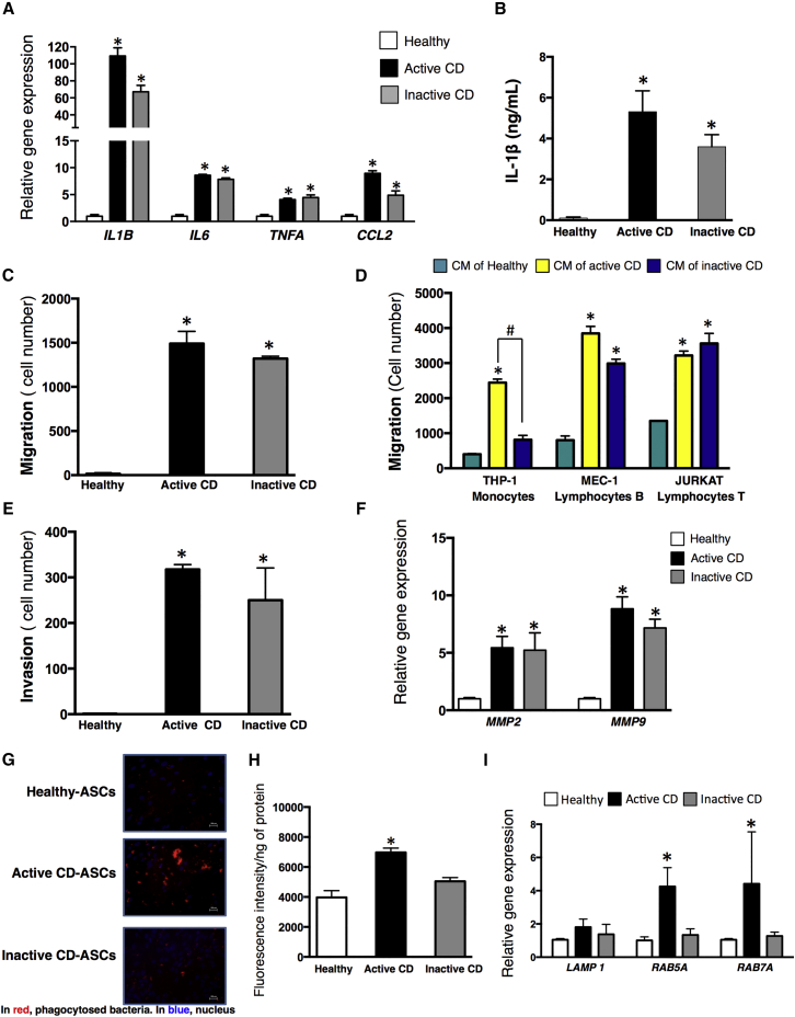 Crohn's disease (CD) is characterized by the expansion of mesenteric fat, also known as "creeping fat." We explored the plasticity and immune properties of adipose-derived stem cells (ASCs) in the context of CD as potential key players in the development of creeping fat. Mesenteric CD-derived ASCs presented a more proliferative, inflammatory, invasive, and phagocytic phenotype than equivalent cells from healthy donors, irrespective of the clinical stage. Remarkably, ASCs from the subcutaneous depot of patients with CD also showed an activated immune response that was associated with a reduction in their immunosuppressive properties. The invasive phenotype of mesenteric CD ASCs was governed by an inflammasome-mediated inflammatory state since blocking inflammasome signaling, mainly the secretion of interleukin-1β, reversed this characteristic. Thus, CD alters the biological functions of ASCs as adipocyte precursors, but also their immune properties. Selection of ASCs with the best immunomodulatory properties is advocated for the success of cell-based therapies.