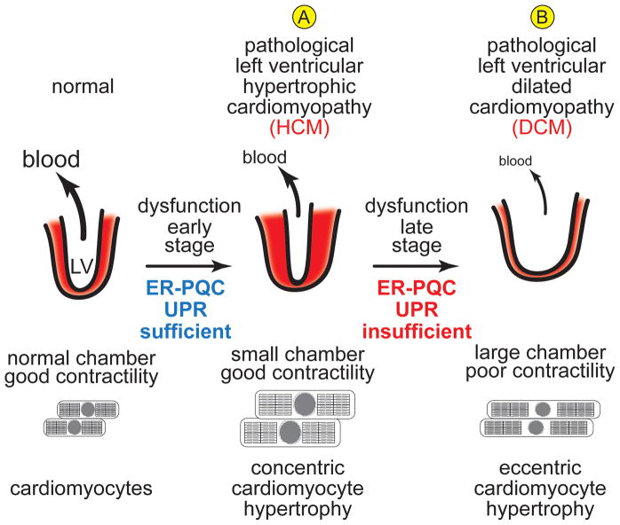 Cardiac myocytes are the cells responsible for the robust ability of the heart to pump blood throughout the circulatory system. Cardiac myocytes grow in response to a variety of physiological and pathological conditions; this growth challenges endoplasmic reticulum-protein quality control (ER-PQC), a major feature of which includes the unfolded protein response (UPR). ER-PQC and the UPR in cardiac myocytes growing under physiological conditions, including normal development, exercise, and pregnancy, are sufficient to support hypertrophic growth of each cardiac myocyte. However, the ER-PQC and UPR are insufficient to respond to the challenge of cardiac myocyte growth under pathological conditions, including myocardial infarction and heart failure. In part, this insufficiency is due to a continual decline in the expression levels of important adaptive UPR components as a function of age and during myocardial pathology. This chapter will discuss the physiological and pathological conditions unique to the heart that involves ER-PQC, and whether the UPR is adaptive or maladaptive under these circumstances.