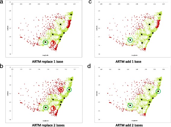 Results: Seven bases could cover 98% of the population within 45mins when optimised for coverage or reach the entire population of the state within an average of 21mins if optimised for response time. Given the existing bases, adding two bases could either increase the 45 min coverage from 91% to 97% or decrease the average response time from 21mins to 19mins. Adding a single specialist prehospital rapid response HEMS to the area of greatest population concentration decreased the average state wide response time by 4mins. The optimum seven base hybrid model that was able to cover 97.75% of the population within 45mins, and all of the population in an average response time of 18 mins included the rapid response HEMS model.