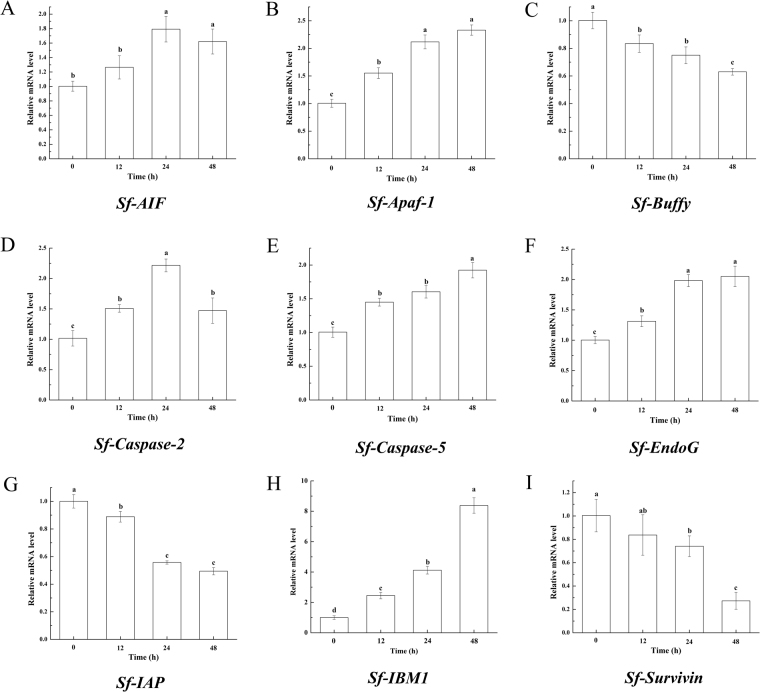 As an important botanical pesticide, azadirachtin demonstrates broad insecticidal activity against many agricultural pests. The results of a previous study indicated the toxicity and apoptosis induction of azadirachtin in Spodoptera frugiperda Sf9 cells. However, the lack of genomic data has hindered a deeper investigation of apoptosis in Sf9 cells at a molecular level. In the present study, the complete transcriptome data for Sf9 cell line was accomplished using Illumina sequencing technology, and 97 putative apoptosis-related genes were identified through BLAST and KEGG orthologue annotations. Fragments of potential candidate apoptosis-related genes were cloned, and the mRNA expression patterns of ten identified genes regulated by azadirachtin were examined using qRT-PCR. Furthermore, Western blot analysis showed that six putative apoptosis-related proteins were upregulated after being treated with azadirachtin while the protein Bcl-2 were downregulated. These data suggested that both intrinsic and extrinsic apoptotic signal pathways comprising the identified potential apoptosis-related genes were potentially active in S. frugiperda. In addition, the preliminary results revealed that caspase-dependent or caspase-independent apoptotic pathways could function in azadirachtin-induced apoptosis in Sf9 cells.