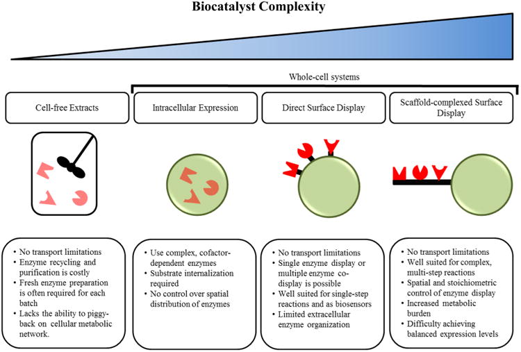 Biocatalysts, especially enzymes, have the ability to catalyze reactions with high product selectivity, utilize a broad range of substrates, and maintain activity at low temperature and pressure. Therefore, they represent a renewable, environmentally friendly alternative to conventional catalysts. Most current industrial-scale chemical production processes using biocatalysts employ soluble enzymes or whole cells expressing intracellular enzymes. Cell surface display systems differ by presenting heterologous enzymes extracellularly, overcoming some of the limitations associated with enzyme purification and substrate transport. Additionally, coupled with directed evolution, cell surface display is a powerful platform for engineering enzymes with enhanced properties. In this review, we will introduce the molecular and cellular principles of cell surface display and discuss how it has been applied to engineer enzymes with improved properties as well as to develop surface-engineered microbes as whole-cell biocatalysts.
