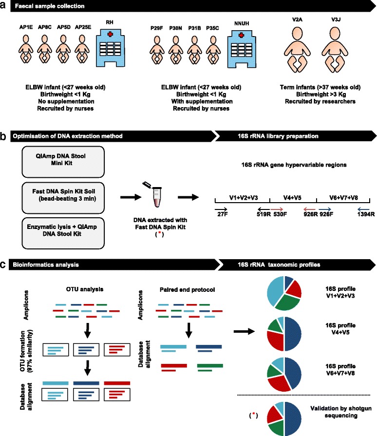 Methods: Using ELBW faecal samples, we compared three different DNA extraction methods, and subsequently PCR amplified and sequenced three hypervariable regions of the 16S rRNA gene (V1 + V2 + V3), (V4 + V5) and (V6 + V7 + V8), and compared two bioinformatics approaches to analyse results (OTU and paired end). Paired shotgun metagenomics was used as a 'gold-standard'.
