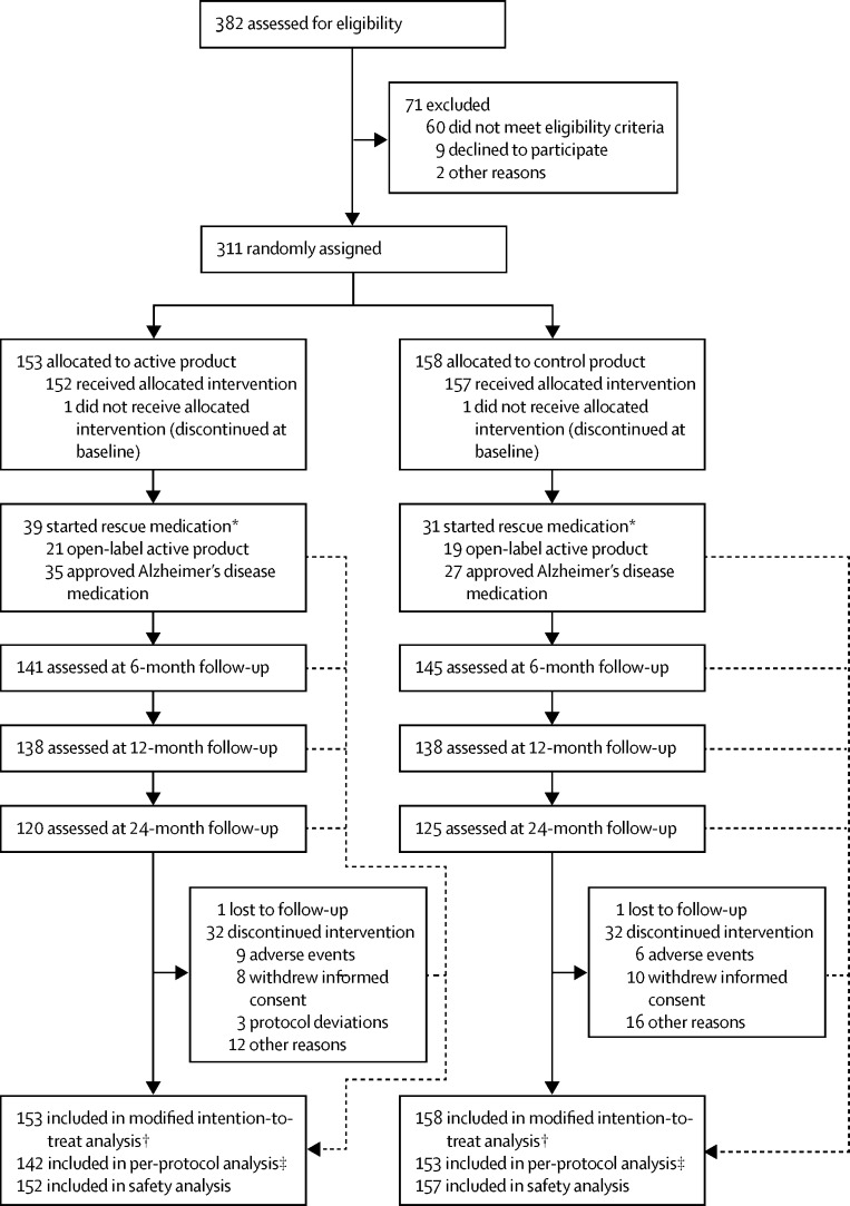 Methods: LipiDiDiet was a 24-month randomised, controlled, double-blind, parallel-group, multicentre trial (11 sites in Finland, Germany, the Netherlands, and Sweden), with optional 12-month double-blind extensions. The trial enrolled individuals with prodromal Alzheimer's disease, defined according to the International Working Group (IWG)-1 criteria. Participants were randomly assigned (1:1) to active product (125 mL once-a-day drink containing Fortasyn Connect) or control product. Randomisation was computer-generated centrally in blocks of four, stratified by site. All study personnel and participants were masked to treatment assignment. The primary endpoint was change in a neuropsychological test battery (NTB) score. Analysis was by modified intention to treat. Safety analyses included all participants who consumed at least one study product dose. This trial is registered with the Dutch Trial Register, number NTR1705.