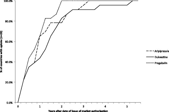 Results: Consumption of the case study medications was seen in all countries. In general, pregabalin was used more often than aripiprazole and duloxetine. In 2 years after market authorization, approximately 80% of all countries have reported use of all three molecules. Correlations between Hofstede dimensions individualism, long-term orientation and indulgence and total use of the case study medications tended to become stronger over time, but they were only statistically significant for indulgence at two years after market authorization (rho = 0.51, p = 0.014) and three years after market authorization (rho = 0.54, p = 0.008). A more detailed analysis showed (slight) variation by molecule.