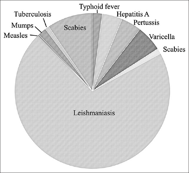 Results: Within the study period, the ten centers served 46,039 patients encounter per month (and average of 4600 patients encounters per center per month). A high number of communicable diseases were noted. Cutaneous leishmaniasis was the most common communicable disease (1170 cases a month). Tuberculosis was treated in 14 patients a month. Other infectious diseases that were almost eradicated before the crises were seen increasingly (29 mumps cases/month, 6 measles cases/month, and 34 cases of typhoid fever/month).
