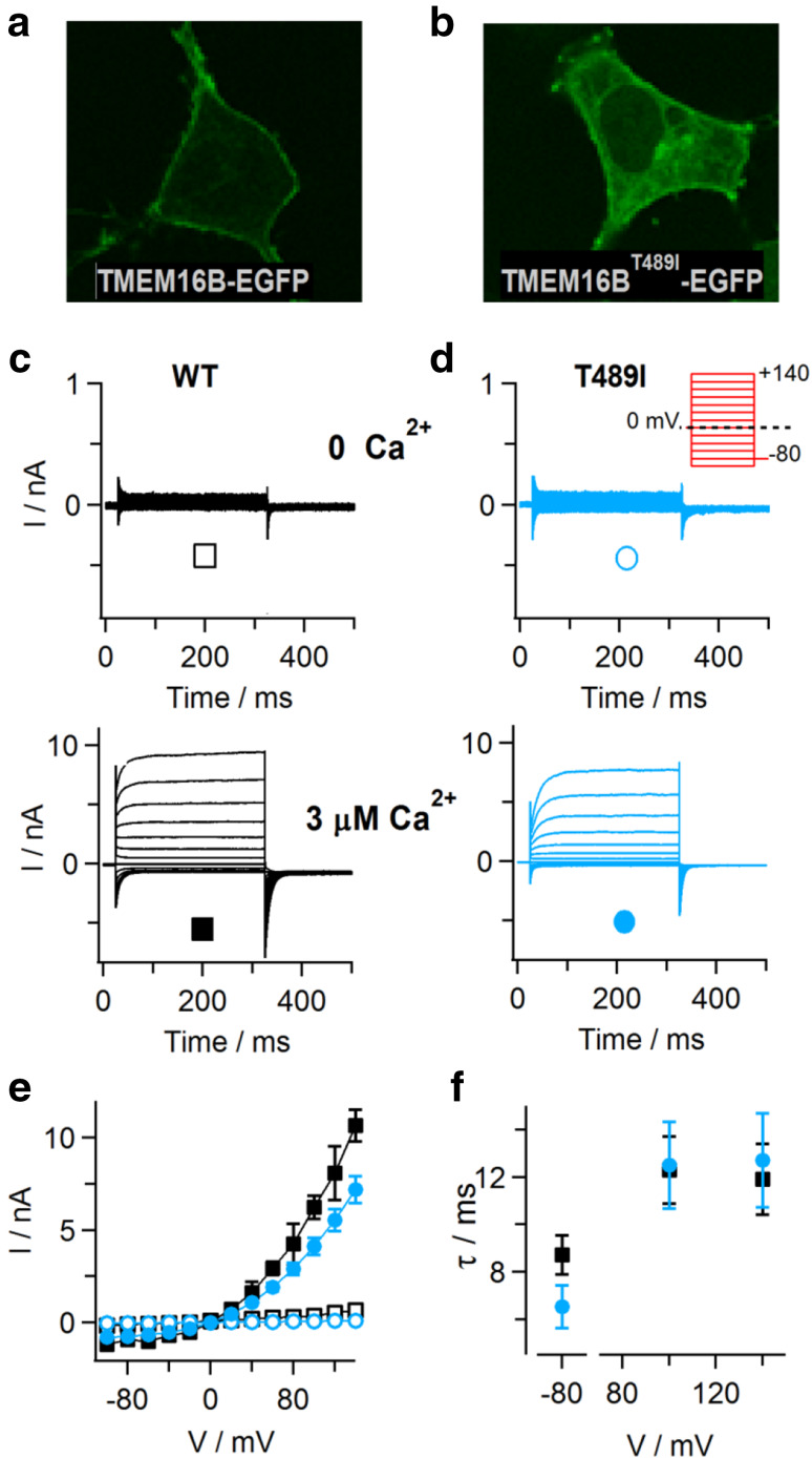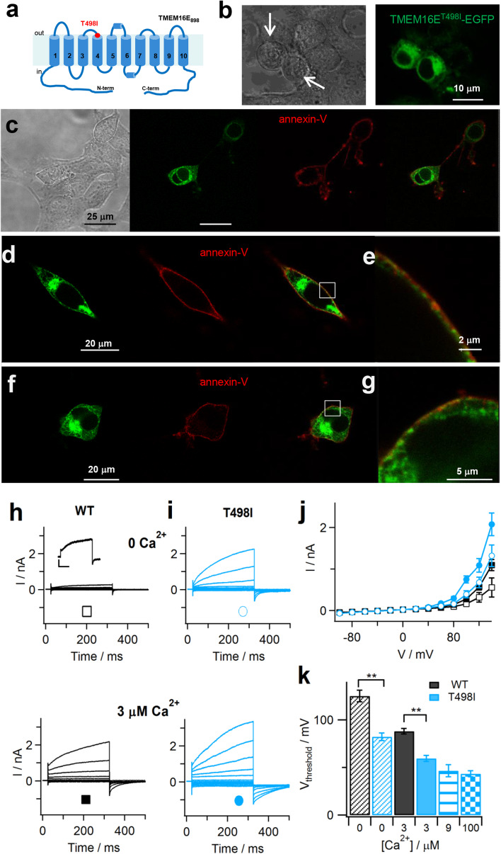 Mutations in the human TMEM16E (ANO5) gene are associated both with the bone disease gnathodiaphyseal dysplasia (GDD; OMIM: 166260) and muscle dystrophies (OMIM: 611307, 613319). However, the physiological function of TMEM16E has remained unclear. We show here that human TMEM16E, when overexpressed in mammalian cell lines, displayed partial plasma membrane localization and gave rise to phospholipid scrambling (PLS) as well as non-selective ionic currents with slow time-dependent activation at highly depolarized membrane potentials. While the activity of wild-type TMEM16E depended on elevated cytosolic Ca2+ levels, a mutant form carrying the GDD-causing T513I substitution showed PLS and large time-dependent ion currents even at low cytosolic Ca2+ concentrations. Contrarily, mutation of the homologous position in the Ca2+-activated Cl- channel TMEM16B paralog hardly affected its function. In summary, these data provide the first direct demonstration of Ca2+-dependent PLS activity for TMEM16E and suggest a gain-of-function phenotype related to a GDD mutation.