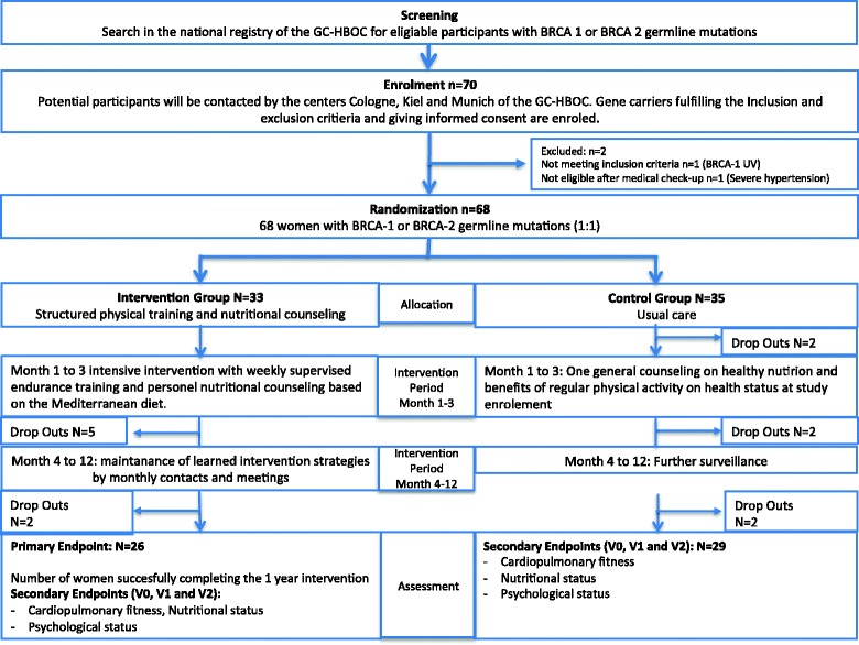 Methods: We implemented a multicenter, prospective randomized controlled trial in BRCA1/2 patients, comparing a lifestyle intervention group (IG) with a control group (CG) with the primary aim to prove feasibility. Intervention comprised a structured, individualized endurance training alongside nutrition education based on the Mediterranean diet (MD) for 3 months, plus monthly group training and regular telephone contact during the subsequent 9 months. The CG attended one session on healthy nutrition and the benefits of physical activity. Primary endpoints were feasibility, acceptance and satisfaction over 12 months. Furthermore, effects on physical fitness, diet profile, body mass index (BMI), quality of life and perceived stress were investigated.
