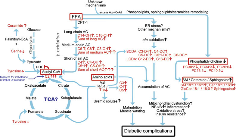 Results: Of 123 metabolites included in the data analysis, 24 differed significantly between DKD and controls in the same direction in both discovery and validation subpopulations. A number of short acylcarnitines including their dicarboxylic derivatives (C2-C6) were elevated in DKD, suggesting abnormalities in fatty acids and amino acids metabolic pathways. Five phosphatidylcholines were lower whereas 4 metabolites in the sphingomyelin-ceramide subfamily were higher in DKD. Principal component regression revealed that long-chain ceramides were independently associated with ACR but not eGFR. Conversely, essential amino acids catabolism and short dicarboxylacylcarnitine accumulation were associated with eGFR but not ACR.