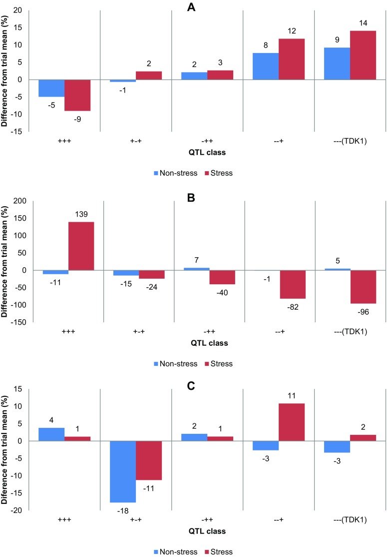 TDK1 is a popular rice variety from the Lao PDR. Originally developed for irrigated conditions, this variety suffers a high decline in yield under drought conditions. Studies have identified three quantitative trait loci (QTLs) for grain yield under drought conditions, qDTY3.1 , qDTY6.1 , and qDTY6.2 , that show a high effect in the background of this variety. We report here the pyramiding of these three QTLs with SUB1 that provides 2-3 weeks of tolerance to complete submergence, with the aim to develop drought- and submergence-tolerant near-isogenic lines (NILs) of TDK1. We used a tandem approach that combined marker-assisted backcross breeding with phenotypic selection to develop NILs with high yield under drought stress and non-stress conditions and preferred grain quality. The effect of different QTL combinations on yield and yield-related traits under drought stress and non-stress conditions is also reported. Our results show qDTY3.1 to be the largest and most consistent QTL affecting yield under drought conditions, followed by qDTY6.1 and qDTY6.2 , respectively. QTL class analysis also showed that lines with a combination of qDTY3.1 and qDTY6.1 consistently showed a higher tolerance to drought than those in which one of these QTLs was missing. In countries such as Lao PDR, where large areas under rice cultivation suffer vegetative-stage submergence and reproductive-stage drought, these lines could ensure yield stability. These lines can also serve as valuable genetic material to be used for further breeding of high-yielding, drought- and submergence-tolerant varieties in local breeding programs.