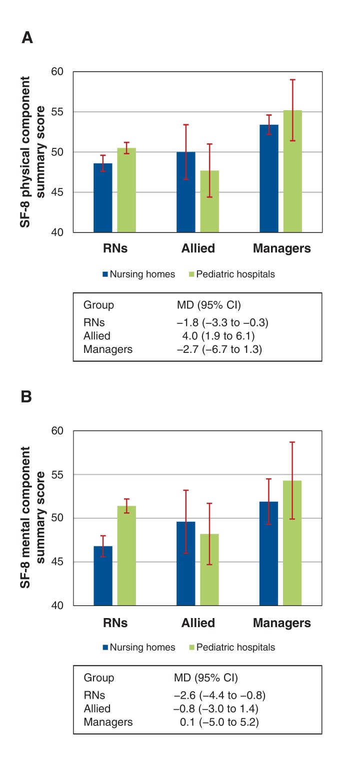 Results: Nursing home workers and registered nurses in pediatric hospitals had poorer mental health than the Canadian population. Scores were lowest for registered nurses in nursing homes (mean difference -4.4 [95% confidence interval -6.6 to -2.6]). Physicians in pediatric hospitals and allied health care providers in nursing homes had better physical health than the general population. We also found important differences in physical/mental health for care provider groups within and between care settings.