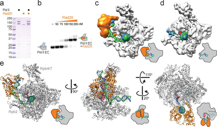 Eukaryotic transcription-coupled repair (TCR) is an important and well-conserved sub-pathway of nucleotide excision repair that preferentially removes DNA lesions from the template strand that block translocation of RNA polymerase II (Pol II). Cockayne syndrome group B (CSB, also known as ERCC6) protein in humans (or its yeast orthologues, Rad26 in Saccharomyces cerevisiae and Rhp26 in Schizosaccharomyces pombe) is among the first proteins to be recruited to the lesion-arrested Pol II during the initiation of eukaryotic TCR. Mutations in CSB are associated with the autosomal-recessive neurological disorder Cockayne syndrome, which is characterized by progeriod features, growth failure and photosensitivity. The molecular mechanism of eukaryotic TCR initiation remains unclear, with several long-standing unanswered questions. How cells distinguish DNA lesion-arrested Pol II from other forms of arrested Pol II, the role of CSB in TCR initiation, and how CSB interacts with the arrested Pol II complex are all unknown. The lack of structures of CSB or the Pol II-CSB complex has hindered our ability to address these questions. Here we report the structure of the S. cerevisiae Pol II-Rad26 complex solved by cryo-electron microscopy. The structure reveals that Rad26 binds to the DNA upstream of Pol II, where it markedly alters its path. Our structural and functional data suggest that the conserved Swi2/Snf2-family core ATPase domain promotes the forward movement of Pol II, and elucidate key roles for Rad26 in both TCR and transcription elongation.