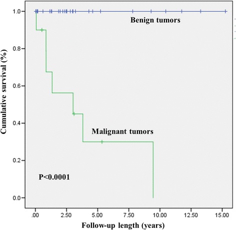 Methods: We collected data on 95 patients with echocardiographic diagnosis or detection of cardiac tumors in a prospective analysis from 1999 to 2014. The median follow-up period was 43 months (0.5-183 months).