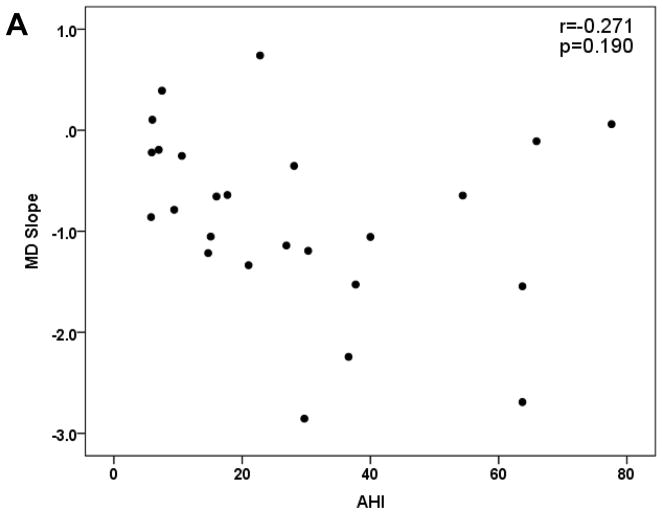 Results: A total of 141 patients with OSAS and glaucoma were identified. Twenty-five patients (age 67.9±7.6 y) with OSAS (8 mild, 8 moderate, 9 severe) were enrolled. Eleven eyes (44%) were classified as progressors, and had more severe baseline VF loss (P=0.03). Progressors and nonprogressors had nonsignificantly different (P>0.05) age (69.9±8.7 vs. 66.4±6.6 y), follow-up (4.4±0.7 vs. 4.3±1.0 y), intraocular pressure (13.1±2.8 vs. 14.9±2.5 mm Hg), mean ocular perfusion pressure (49.7±5.5 vs. 48.8±9.0 mm Hg), AHI (31.3±18.6 vs. 26.4±24.0), body-mass index (27.8±5.5 vs. 28.8±5.6), and SpO2 (94.1±1.6% vs. 94.0±1.6%). AHI was not correlated with slopes of VF mean deviation (r, -0.271; P, 0.190) or pattern standard deviation (r, 0.211; P, 0.312), and no substantial increase in risk of progression was found with increase in AHI.