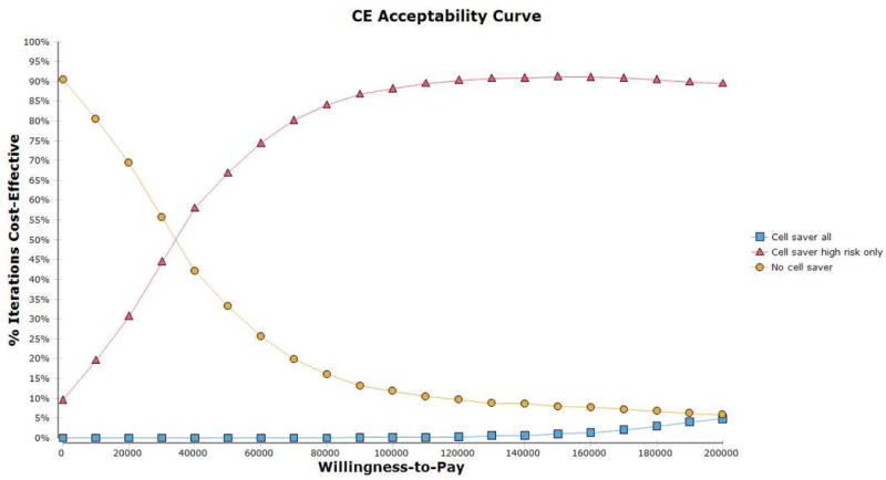 Results: Cell salvage use for cases at high risk for hemorrhage was cost-effective (incremental cost-effectiveness ratio, $34,881 per quality-adjusted life-year gained). Routine cell salvage use for all cesarean deliveries was not cost-effective, costing $415,488 per quality-adjusted life-year gained. Results were not sensitive to individual variation of other model parameters. The probabilistic sensitivity analysis showed that at the $100,000 per quality-adjusted life-year gained threshold, there is more than 85% likelihood that cell salvage use for cases at high risk for hemorrhage is favorable.