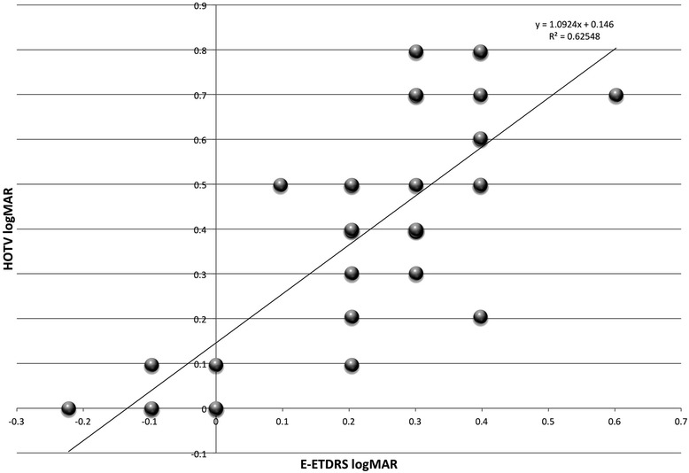 Results: The 31 treated amblyopic eyes showed: logMAR HOTV = 0.97(logMAR E-ETDRS)-0.04 r2 = 0.88. All but two (6%) fell less than 2 lines difference. The five showed logMAR HOTV = 1.09 ((logMAR E-ETDRS) + .15 r2 = 0.63. The critical-line, test box was 98% efficient at screening within one line of 20/40.