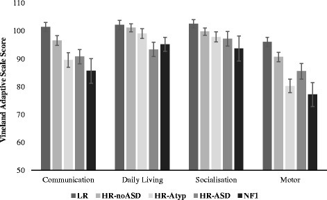 Results: Infants with NF1 showed striking impairments in motor functioning relative to low-risk infants; this pattern was seen in infants with later ASD from the familial cohort (HR-ASD). Both infants with NF1 and the HR-ASD group showed communication delays relative to low-risk infants.