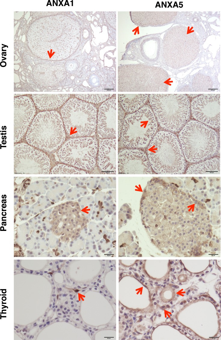 Gonadotropin-releasing hormone (GnRH) regulates gonadotropin secretion. We previously demonstrated that the expression of annexin A5 (ANXA5) is stimulated by GnRH in gonadotropes and has a significant role in gonadotropin secretion. It is therefore of interest to know whether other members of the ANXA family, which consists of twelve structurally related members, are also regulated by GnRH. Therefore, the expression of all annexins was examined in LβT2 gonadotrope cells. ANXA4, A5, A6, A7 and A11 were detected in LβT2 cells. The expression of ANXA5 and A1 mRNA was stimulated by a GnRH agonist. An increase in ANXA1 protein by this agonist was demonstrated by western blotting. Immunohistochemistry showed that ANXA1 was present in the nucleus and to a lesser extent in the cytoplasm of some rat pituitary cells. The GnRH agonist induced translocation of ANXA1 to the periphery of LβT2 cells. The presence of ANXA1 in gonadotropes and its increase upon GnRH agonist treatment were confirmed in a primary pituitary cell culture. ANXA1 expression was also demonstrated in the ovary, the testis, the thyroid gland and the pancreas in a different manner to that of ANXA5. These data suggest that ANXA1 is a novel GnRH target gene in gonadotropes. ANXA1 also may be a target of local GnRH in peripheral tissues and may have a different role than that of ANXA5.