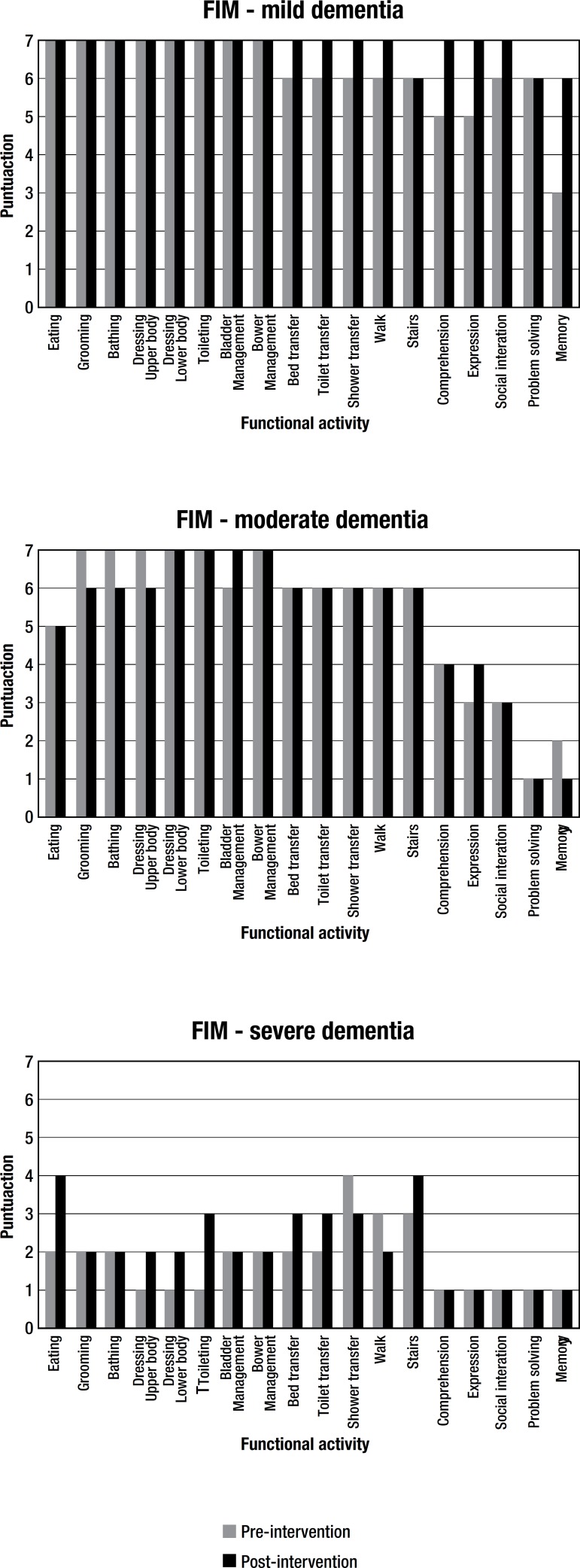 Methods: Three cases with clinically-confirmed dementia enrolled on an interdisciplinary rehabilitation program were reported. The following instruments were applied: Mini Mental-State Exam, Clinical Dementia Rating, Geriatric Depression Scale, Lawton & Brody Index, and the Functional Independence Measure for adults (FIM). The therapeutic strategies were individualized and designed based on patient performance on the FIM, according to the criteria of the Classification of Functionality, Disability and Health, implemented at the house of therapy of the Center for Integrated Rehabilitation together with provision of guidance.