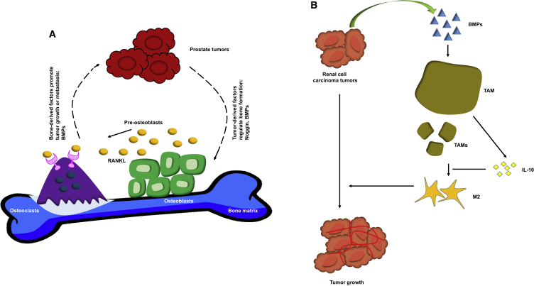 Bone morphogenetic proteins (BMPs) are a diverse class of molecules with over 20 growth factor proteins that belong to the transforming growth factor-β (TGF-β) family and are highly associated with bone formation and disease development. Aberrant expression of various BMPs has been reported in several cancer tissues. Biological function studies have elicited the dual role of BMPs in both cancer development and suppression. Furthermore, a variety of BMP antagonists, ligands, and receptors have been shown to reduce or enhance tumorigenesis and metastasis. Knockout mouse models of BMP signaling components have also revealed that the suppression of BMP signaling impairs cancer metastasis. Herein, we highlight the basic clinical background and involvement of BMPs in modulating cancer progression and their dynamic interactions (e.g., with microRNAs) in the tumor microenvironment in addition to their mutations and roles in chemoprevention. We also suggest that BMPs should be considered a powerful putative therapeutic target in tumorigenesis and bone metastasis.