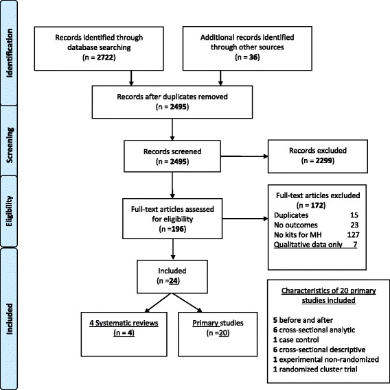 Objective: We conducted a systematic review to summarize the evidence on the uptake, effectiveness and safety of supply kits for maternal care.