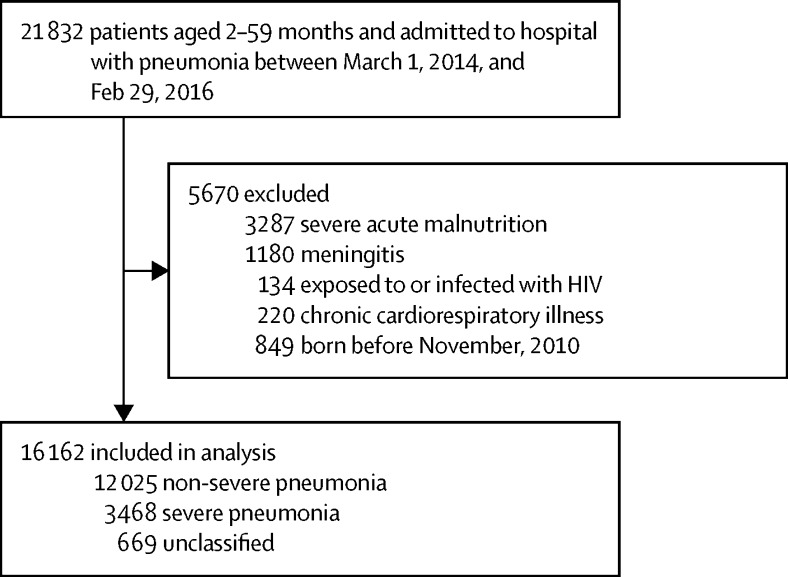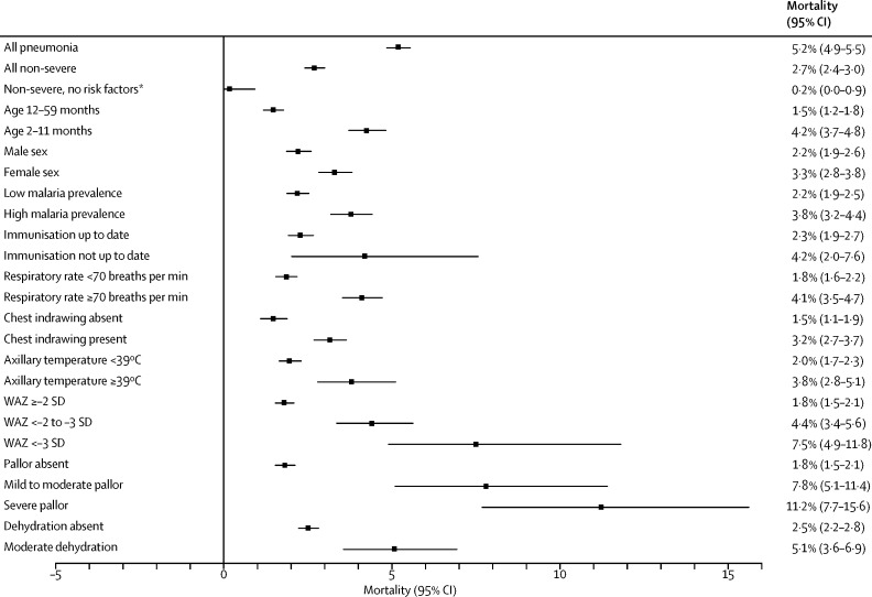 Findings: We assessed 16 162 children who were admitted to hospital in this period. 832 (5%) of 16 031 children died. Among groups defined according to new WHO guidelines, 321 (3%) of 11 788 patients with non-severe pneumonia died compared with 488 (14%) of 3434 patients with severe pneumonia. Three characteristics were strongly associated with death of children retrospectively classified as having non-severe pneumonia: severe pallor (adjusted risk ratio 5·9, 95% CI 5·1-6·8), mild to moderate pallor (3·4, 3·0-3·8), and weight-for-age Z score (WAZ) less than -3 SD (3·8, 3·4-4·3). Additional factors that were independently associated with death were: WAZ less than -2 to -3 SD, age younger than 12 months, lower chest wall indrawing, respiratory rate of 70 breaths per min or more, female sex, admission to hospital in a malaria endemic region, moderate dehydration, and an axillary temperature of 39°C or more.