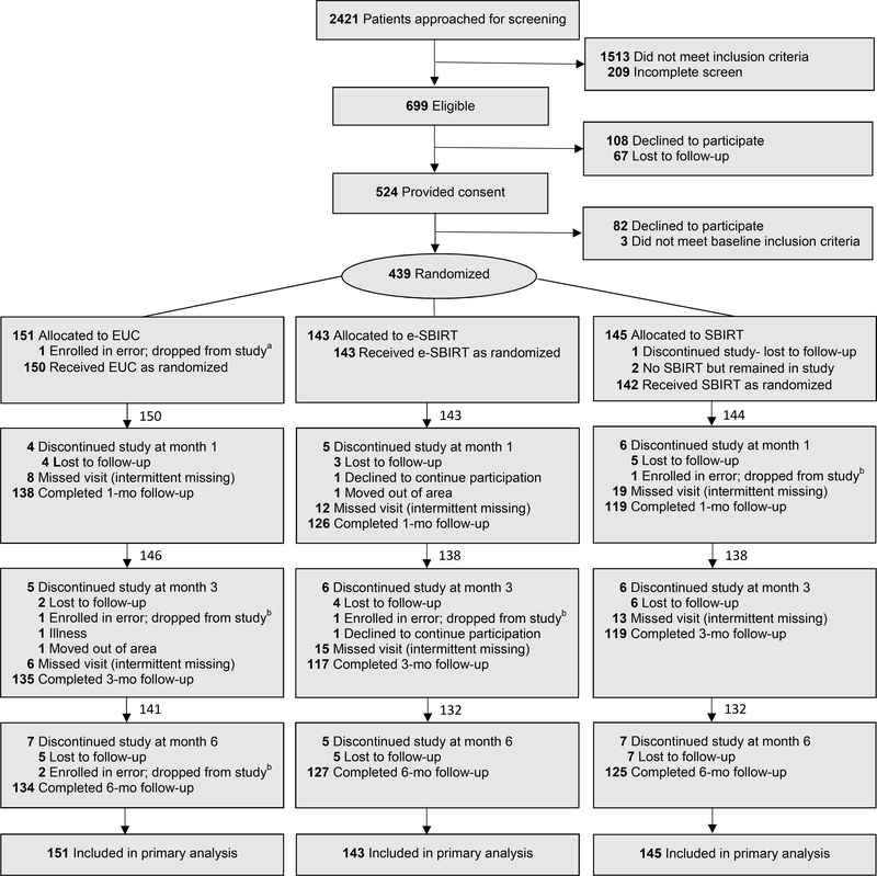 Objective: The purpose of this study was to determine whether "screening, brief intervention and referral to treatment" that is delivered either electronically or by clinician are more effective than enhanced usual care in decreasing days of primary substance use.