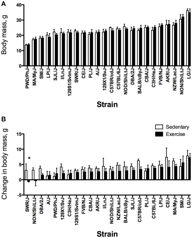 Changes in cardiorespiratory fitness in response to a standardized exercise training protocol differ substantially between individuals. Results from cross-sectional, twin, and family studies indicate genetics contribute to individual differences in both baseline exercise capacity and the response to training. Exercise capacity and responses to training also vary between inbred strains of mice. However, such studies have utilized a limited number of inbred strains. Therefore, the aim of this study was to characterize exercise-training responses in a larger number of genetically diverse strains of inbred mice and estimate the contribution of genetic background to exercise training responses. Eight-week old male mice from 24 inbred strains (n = 4-10/strain) performed a graded exercise test before and after 4 weeks of exercise training. Before training, exercise capacity was significantly different between strains when expressed as time (range = 21-42 min) and work performed (range = 0.42-3.89 kg·m). The responses to training also were significantly different between strains, ranging from a decrease of 2.2 min in NON/ShiLtJ mice to an increase of 8.7 min in SWR/J mice. Changes in work also varied considerably between the lowest (-0.24 kg·m in NON/ShiLtJ) and highest (+2.30 kg·m in FVB/NJ) performing strains. Heart and skeletal muscle masses also varied significantly between strains. Two broad sense heritability estimates were calculated for each measure of exercise capacity and for responses to training. For change in run time, the intraclass correlation between mice within the same inbred strain (rI) was 0.58 and the coefficient of genetic determination (g2) was 0.41. Heritability estimates were similar for the change in work: rI = 0.54 and g2 = 0.37. In conclusion, these results indicate genetic background significantly influences responses to exercise training.